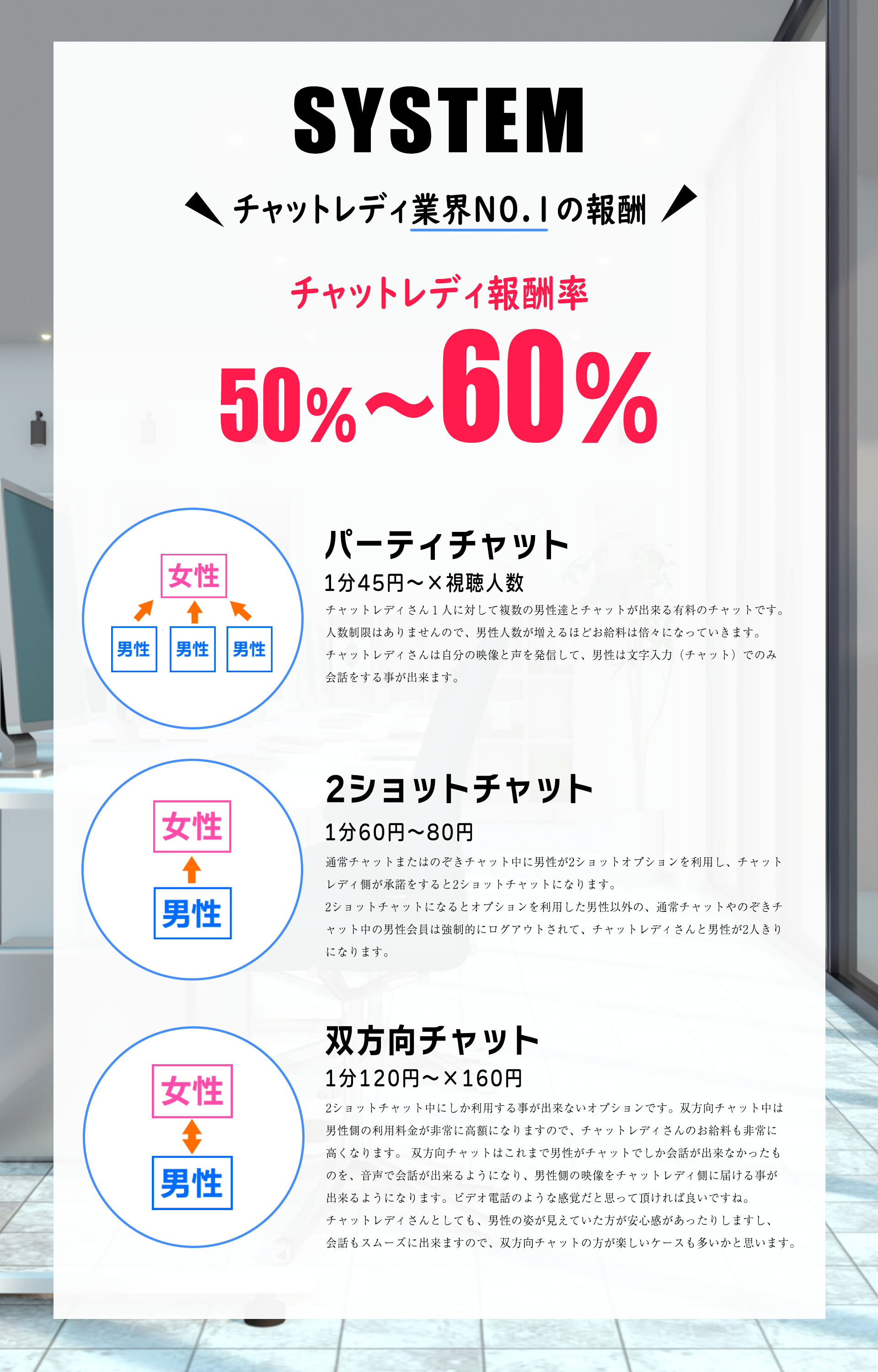チャットレディのお仕事は「在宅」「通勤」と大きく2つから選べます在宅チャットレディはスマホかPCがあればすぐにでも始められます。時間を選ばず好きな時に稼げるので主婦や在宅勤務の副業としても人気の形態です。「家族と同居しているから自宅ではチャットができない…という方は「通勤」がおすすめです。通勤チャットレディは手ぶらでOK!環境の整った完全個室のチャットルームでお仕事できます♪