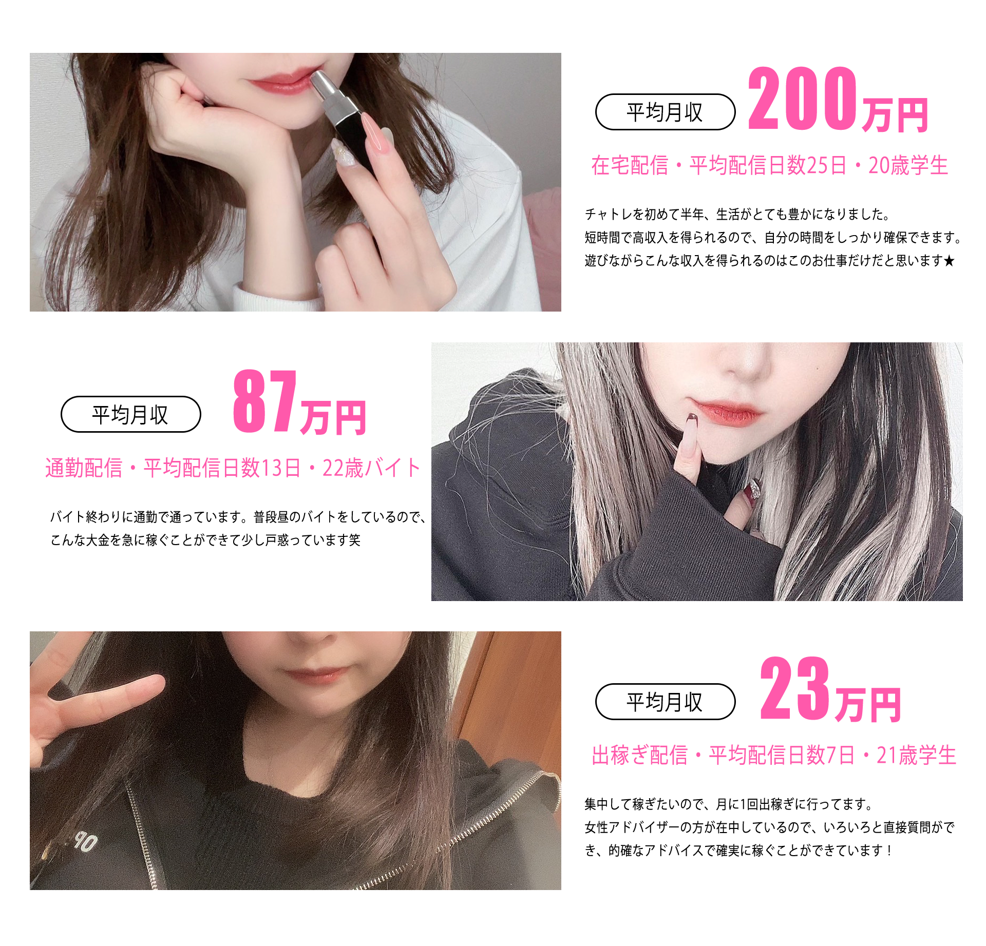- 通勤・在宅・出稼ぎの3つの働き方を選べます。